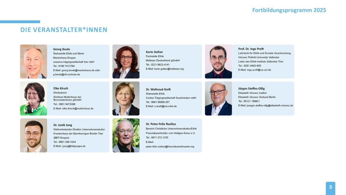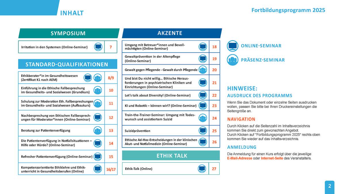 In dem vorliegenden Jahresprogramm bündeln die beteiligten christlichen Trägerorganisationen im Gesundheits- und Sozialwesen ihre Fortbildungs- und Beratungsangebote im Bereich der Angewandten Ethik. Das Angebot richtet sich an alle Personen, Professionen und Organisationen des Gesundheits- und Sozialwesens, sowohl im ambulanten als auch stationären Bereich.