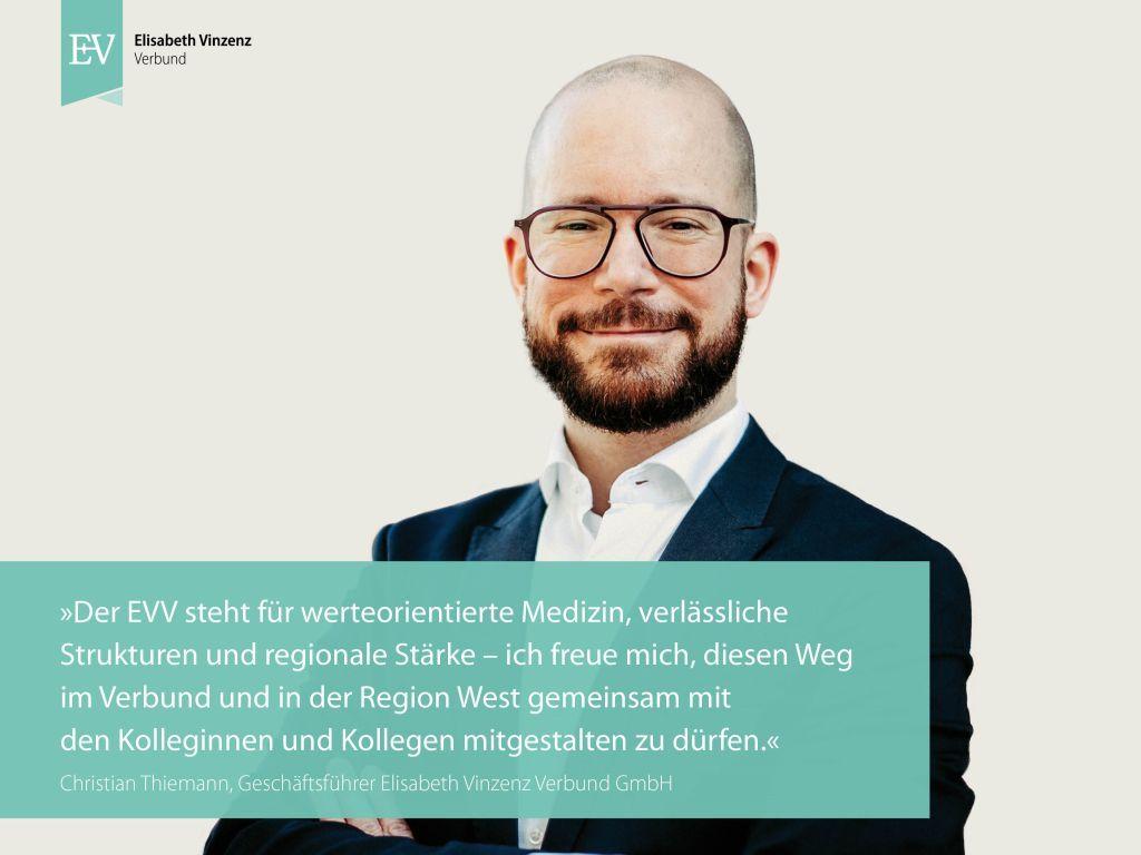 Der Aufsichtsrat der Elisabeth Vinzenz Verbund GmbH hat Christian Thiemann in die Geschäftsführung des EVV berufen. Seinen Dienst wird er am 15. April 2026 antreten. Gemeinsam mit Tobias Dreißigacker und Peter Pfeiffer wird Thiemann künftig den katholischen Krankenhausträger mit seinen zwölf Krankenhäusern und weiteren Einrichtungen in fünf Bundesländern führen.