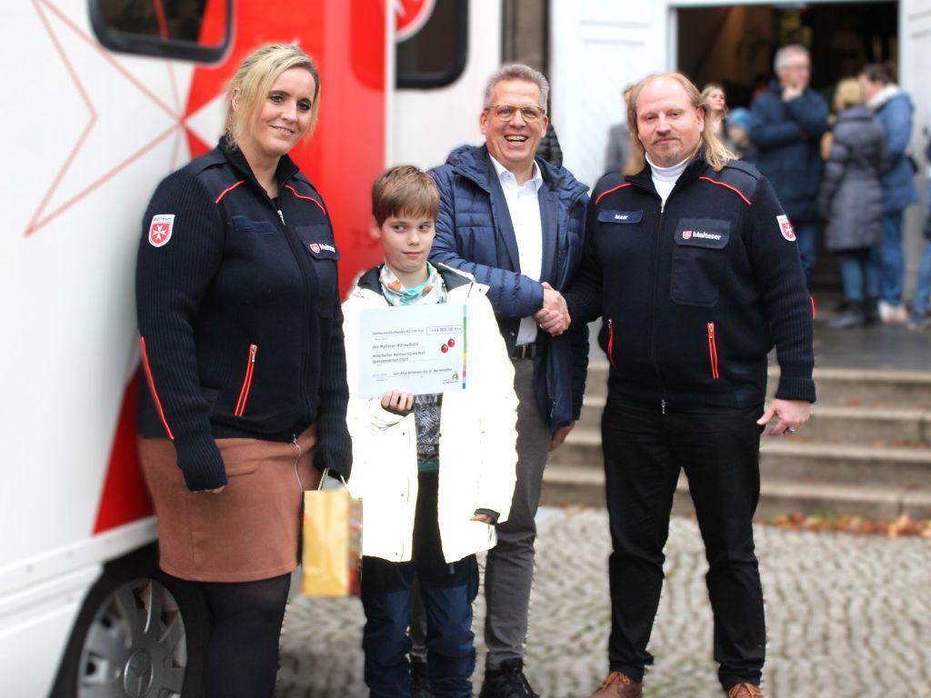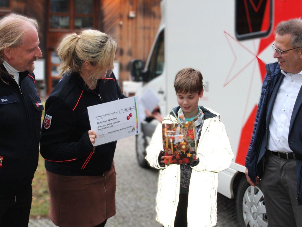 Der Scheck wurde ehrenhalber vom 11jährigen Michel überreicht. Weil seine Mama im Marienstift arbeitet, hat er von der Spendenaktion gehört und direkt mal zwei Monatstaschengelder beigesteuert.