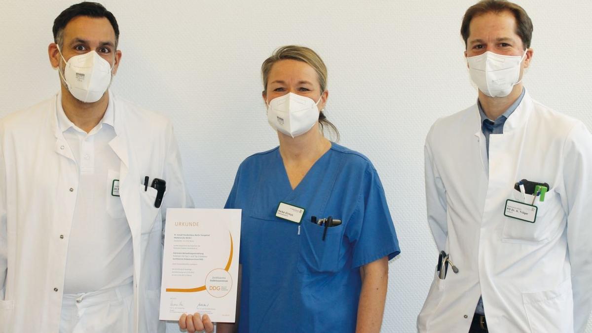 Voraussetzungen für die Zertifizierung sind unter anderem ausreichend hohe Behandlungszahlen sowie qualifizierte Mitarbeitende in den Bereichen Diabetologie, Diabetesberatung und Wundmanagement. „Stationäre Behandlungseinrichtung Patienten mit Typ-1- und Typ-2-Diabetes Zertifiziertes Diabeteszent-rum DDG“ lautet die offizielle Bezeichnung, die die Medizinische Klinik I nun weiterhin bis Februar 2025 führen darf. „Es freut mich sehr, dass wir den Weg als zertifiziertes Diabeteszentrum weitergehen können. Gerade in Zeiten der Pandemie ist es keine Selbstverständlichkeit, eine Zertifizierung erfolgreich zu bestehen“, betont Tobias Dreißigacker, Geschäftsführer des St. Joseph Krankenhauses. „Die Rezertifizierung bestärkt unser engagiertes Team in seiner täglichen Arbeit und unterstreicht unseren hohen Anspruch an eine leitliniengerechte Versorgung in allen Bereichen – Therapie, Beratung und Schulung.“