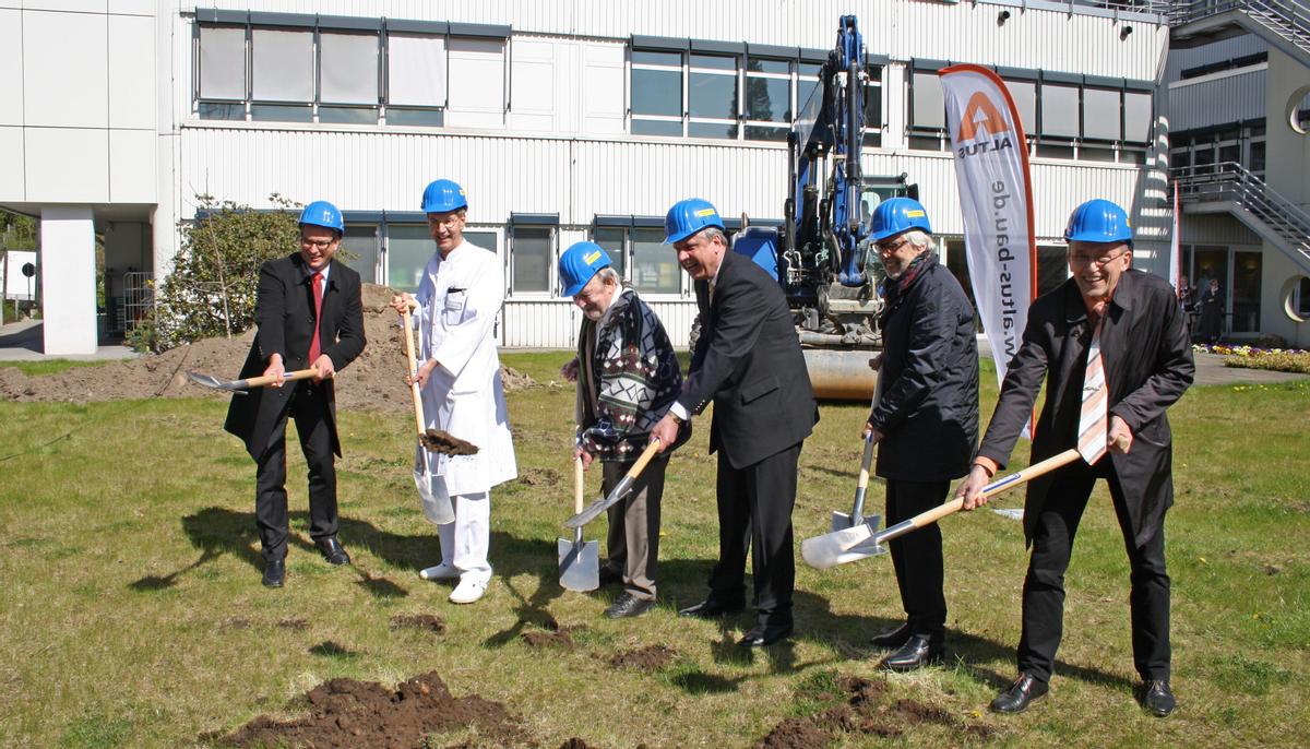 Den symbolträchtigen Spatenstich auf der Südseite des Krankenhauses wagten: Reinbeks Bürgermeister Björn Warmer, der Ärztliche Direktor Prof. Dr. Stefan Jäckle, Reinbeks Bürgervorsteher Ernst-Dieter Lohmann, Krankenhaus-Geschäftsführer Lothar Obst sowie die Architekten Thomas Jansen und Michael Schurig vom Architekturbüro „tönies + schroeter + jansen“ (tsj) aus Lübeck. (KH Reinbek)