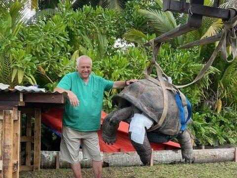 Am 12. Januar treffen die Helfer, die ihre spezielle medizinische Ausrüstung zuvor in ein Kleinflugzeug umgeladen hatten, auf Desroches ein. Erwartet werden sie bereits von Verantwortlichen der Island Conservation Society Seychelles, der für den Ausbau der Infrastruktur und den Naturschutz auf der Inselgruppe zuständigen Behörde. Zudem ist die gesamte Bevölkerung der Insel, rund 200 Einwohnerinnen und Einwohner, auf den Beinen. Alle wollen am Schicksal ihres geliebten „Inselmaskottchens“ teilhaben und Zeugen seiner Rettung sein.