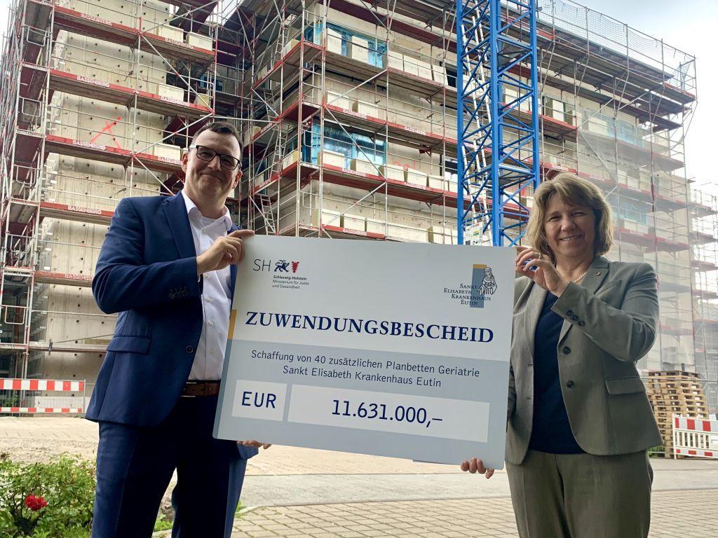Gesundheitsministerin Kerstin von der Decken hat bei ihrem Besuch im Sankt Elisabeth Krankenhaus Eutin (SEK Eutin) einen Zuwendungsbescheid in Höhe von rund 11,6 Mio. Euro an Geschäftsführer Dirk Beutin übergeben. Mit den Mitteln wird der Erweiterungsbau der geriatrischen Station im SEK Eutin gefördert. Die Station wird sich im zweiten und dritten Obergeschoss über der Palliativstation befinden, die ebenfalls neu gebaut und vom Land gefördert wurde.