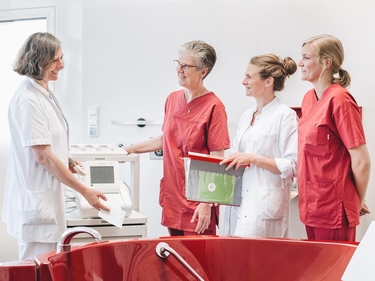 „Seit wir das neue Entbindungsbad haben, wurden schon 12 Kinder in der Wanne geboren“, freut sich die leitende Hebamme Eva-Maria Bittner. „Für uns Hebammen ist eine Wassergeburt durchaus anstrengend, wir agieren ja mitunter lange Zeit vornübergebeugt. Aber das schöne Geburtserlebnis und das Feedback der Frauen sind es uns allemal wert“, ergänzt Kerstin Blankenburg, seit 2003 als Hebamme mit besonderer Begeisterung für Wassergeburten am St. Joseph-Stift tätig.