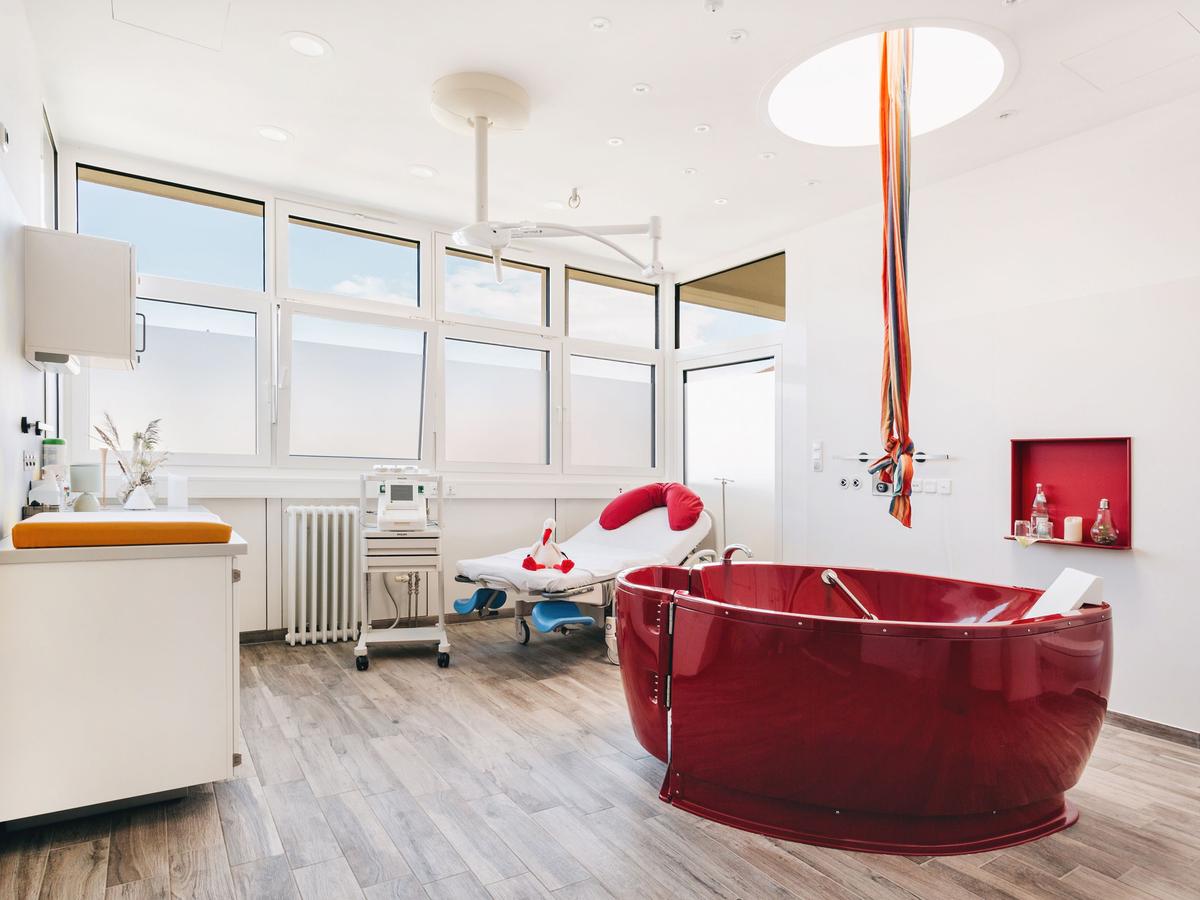 Im Zentrum befindet sich die geräumige Entbindungswanne mit einem Fassungsvermögen von 350 Litern in einem kräftigen Rotton. Die Farbwahl ist kein Zufall. Sie ist an den weiblichen Uterus angelehnt und soll dem Baby einen sanften Übergang aus dem Mutterleib in die Außenwelt erleichtern.