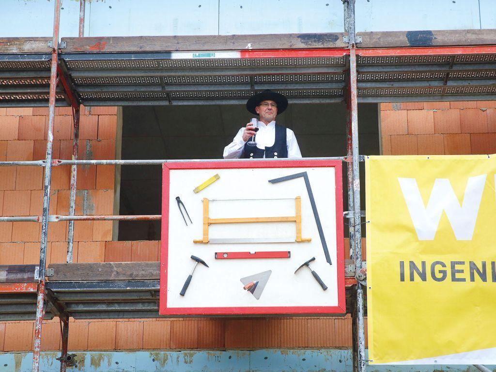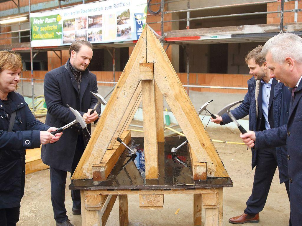 Den Ritualen zum Richtfest folgend, schlugen danach Carolina Böhm, Sebastian Wiedenhaupt, Tino Hortig und Dr. Jakob Florack vier letzte Nägel mit gebotener Symbolkraft in das Miniaturmodell eines Dachstuhls ein. Der Zimmermann des bauausführenden Unternehmens hob zum Segen für den Bau sein Glas, dankte seinerseits Bauherren wie Bauleuten und warf das Glas zu Boden: Mögen die Scherben dem Haus nachhaltig Glück bringen.