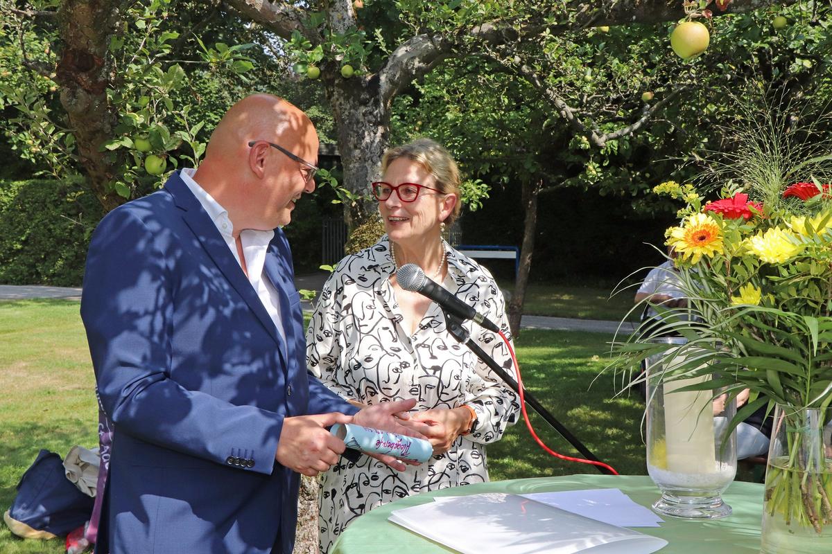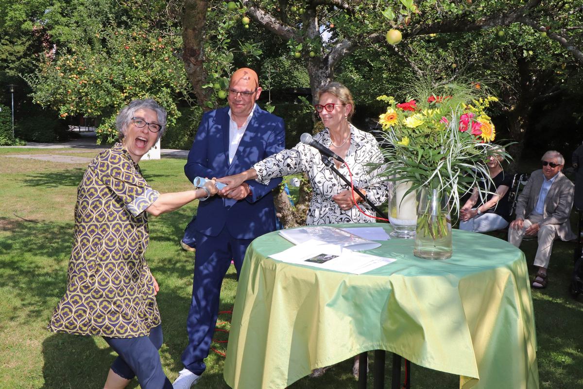 Zur Verabschiedung und den Neuanfang kamen rund 70 geladene Gäste in den Patientengarten des Krankenhauses. Unter freiem Himmel und im Schatten von früchtetragenden alten Apfelbäumen wurde hier eine Freiluft-Andacht gefeiert. Im Anschluss verabschiedete Pflegedirektor Nils-Michael Wulf Christa Knigge für das Direktorium in den Ruhestand. Dabei bedankte er sich für ihr außerordentliches Engagement in der Pflegeausbildung im Haus, aber auch in Schleswig-Holstein. „Unzählige Schülerinnen und Schüler hast du bei ihrer Berufswahl begleitet, tausende Gespräche geführt, die die Zukunft vieler Menschen beeinflusst haben. Und stolze 3 Curricula, also gesetzliche Änderung in der Pflegeausbildung, hast du durch konkrete Lehrpläne mit Leben gefüllt.“ Wulf stellte heraus, dass Knigge ein großer Verdienst für den stetigen Ausbau und die Modernisierung der Pflegeschule zukommt, auch weil sie sich selbst immer weiterbildete, zuletzt mit einem Masterstudiengang. „Du hast dir über die Jahre ein fantastisches Team eingestellt und das E-Learning bei uns eingeführt, das uns beim Lock-down der Schulen sehr geholfen hat.“