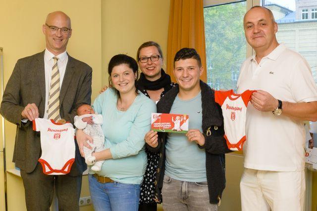 „Für uns als Hallescher FC ist diese Maßnahme eine Investition in die Zukunft, die wir sehr gern tätigen. Wir wünschen allen neuen Mitbürgern beste Gesundheit und einen sorgenfreien Start ins Leben“, erklärte Dr. Jürgen Fox bei der Übergabe der ersten HFC-Strampler an den kleinen Lionel und seine frischgebackenen Eltern.